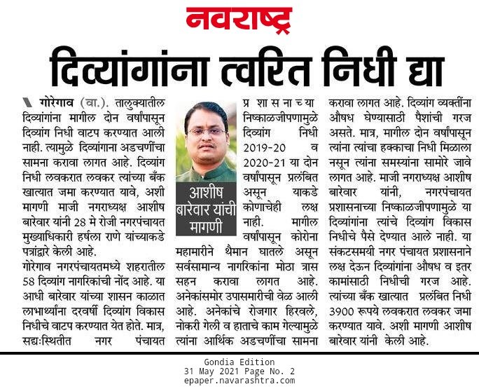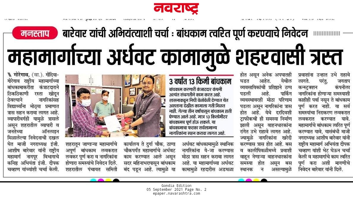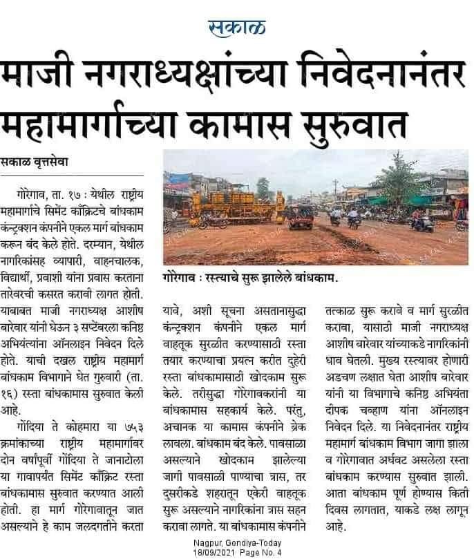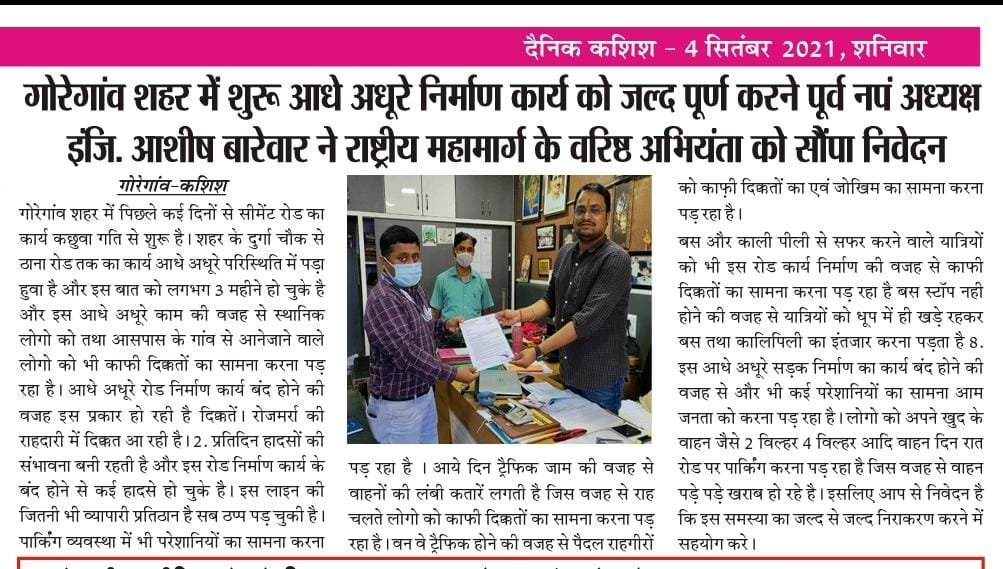 गोरेगांव शहर में शुरू आधे-अधूरे निर्माण कार्य को जल्द पूर्ण करने के पूर्व नाप अध्यक्ष इंजी. आशीष बारेवार ने राष्ट्रीय महामार्ग के वरिष्ठ अभियंता को सौंपा निवेदन