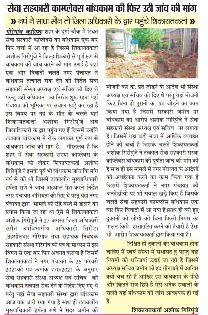 सेवा सहकारी कॉम्प्लेक्स के बांधकाम की फिर उठी जांच की मांग