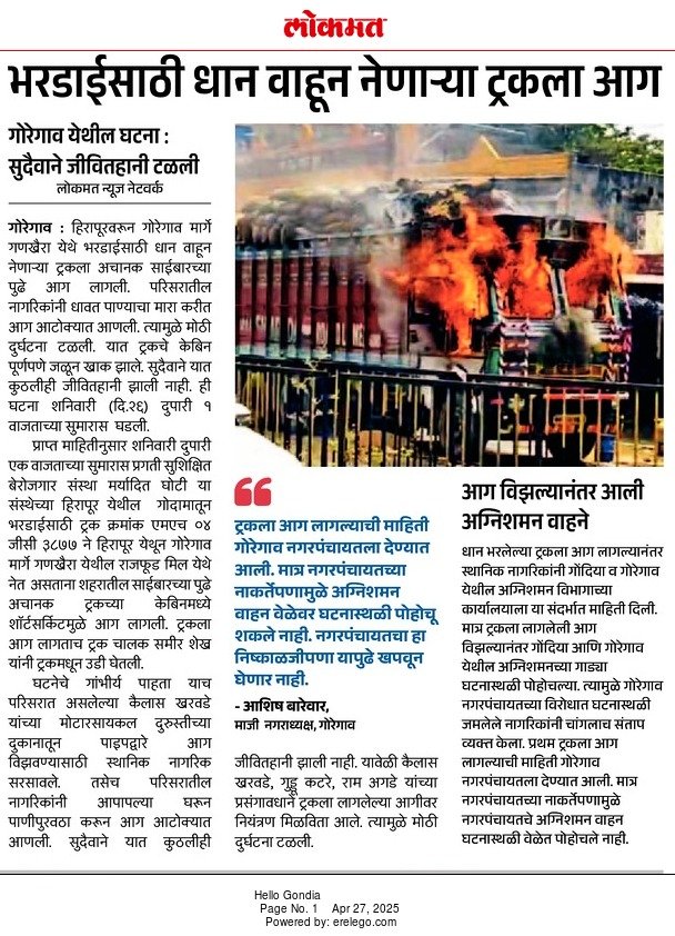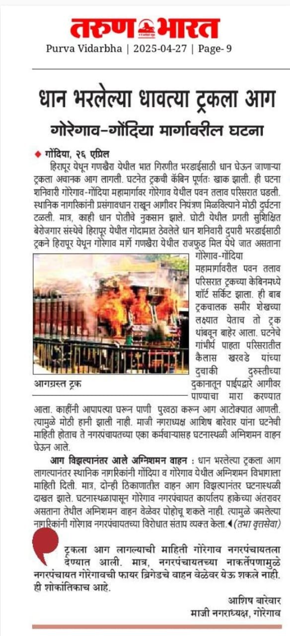 धान भरलेल्या धावत्या ट्रकला आग गोरेगाव-गोंदिया मार्गावरील घटना